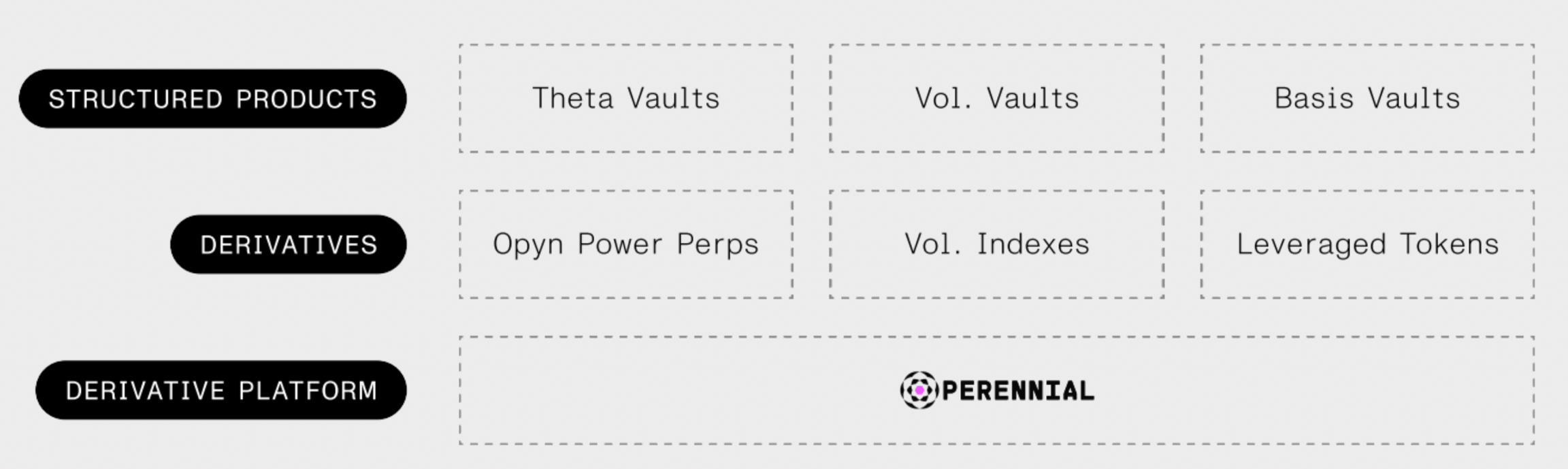 Perennial is designed to be a minimalist protocol that is supported by a whole ecosystem of products built on top, each creating a unique experience for a specific subset of users. This includes things like LP yield vaults, novel financial products (especially structured products), and new protocols that leverage the power of derivatives under the hood.